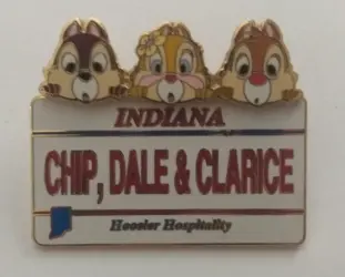 Indiana - Chip, Dale and Clarice - Hoosier Hospitality is a Limited Edition (LE) 2000 pin from the Across America License Plate Series pin series. It was originally released on , 2003 and was available from Disney Store Japan .