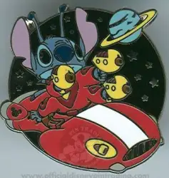 Stitch on a Flying Saucer is an Open Edition pin from the Cast Lanyard Collection IV - Stitch pin series. It was originally released on , 2005 and was available from Walt Disney World .