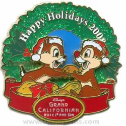 Grand Californian Hotel & Spa - Chip & Dale Wreath is a Limited Edition (LE) 1000 pin from the Resorts Holiday Collection 2008: Ornaments & Wreaths pin series. It was originally released on , 2008 and was available from Disneyland Resort .