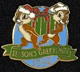 Season's Greetings 1992 - Chip & Dale is a Limited Release pin from the DLR Cast Member Holiday Work Gifts - Christmas pin series. It was originally released on , 1992 and was available from Theme Park Cast Member Exclusive .