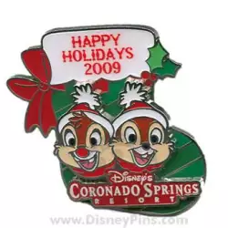 Coronado Springs Resort - Chip & Dale Stocking is an Open Edition pin from the Resort Holiday Collection 2009: Stockings pin series. It was originally released on , 2009 and was available from Walt Disney World .