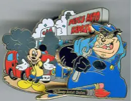 Car Trouble - Mickey and Pete is a Limited Edition (LE) 500 pin from the Pin Route 498: Artist Choice pin series. It was originally released on , 2005 and was available from Walt Disney World .