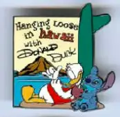 Stitch and Donald is a Limited Edition (LE) 300 pin in the A Surfin' Road Trip 5-pin set from the Pin Route 498 Pin Celebration 2005 pin series. It was originally released on , 2005 and was available from Walt Disney World .