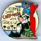 Stitch and Goofy is a Limited Edition (LE) 300 pin in the A Surfin' Road Trip 5-pin set from the Pin Route 498 Pin Celebration 2005 pin series. It was originally released on , 2005 and was available from Walt Disney World .