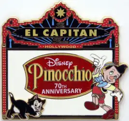 Pinocchio (70th Anniversary) is a Limited Edition (LE) 150 pin from the El Capitan Marquee Series pin series. It was originally released on , 2009 and was available from Disney Studio Store Hollywood / Soda Fountain .