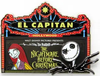 Jack & Sally #7 is a Limited Edition (LE) 300 pin from the El Capitan Marquee Series pin series. It was originally released on , 2010 and was available from Disney Studio Store Hollywood / Soda Fountain .