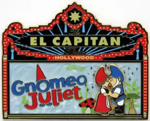 Gnomeo & Juliet is a Limited Edition (LE) 150 pin from the El Capitan Marquee Series pin series. It was originally released on , 2011 and was available from Disney Studio Store Hollywood / Soda Fountain .
