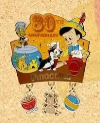 Pinocchio, Figaro, Jiminy Cricket, and Cleo with Dangle Elements is a Limited Edition (LE) 600 pin from the Pinocchio 80th Anniversary pin series. It was originally released in July, 2020 and was available from Hong Kong Disneyland .