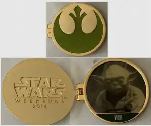 Yoda is a Limited Release pin from the Star Wars Weekends 2014 - Reveal / Conceal pin series. It was originally released on , 2014 and was available from Walt Disney World .