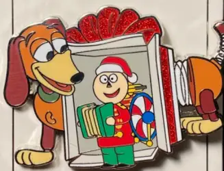 Slinky Dog and Tinny is an Open Edition pin from the Christmas Holiday 2020 pin series. It was originally released on , 2020 and was available from Multiple Sources (WDW, DLR, etc.).