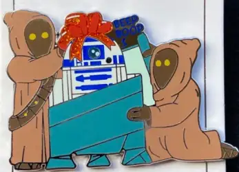 Jawas Gift Wrapping R2-D2 is an Open Edition pin from the Star Wars Holiday pin series. It was originally released on , 2020 and was available from Multiple Sources (WDW, DLR, etc.).