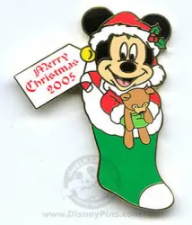 Mickey Stocking is a Limited Edition (LE) 2000 pin from the Merry Christmas 2005 - Pin Pursuit pin series. It was originally released on , 2005 and was available from Walt Disney World .