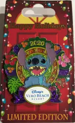Vero Beach Resort - Stitch Wreath is a Limited Edition (LE) 750 pin from the Resort Holiday Collection 2020: Glitter Wreaths pin series. It was originally released in November, 2020 and was available from Walt Disney World .