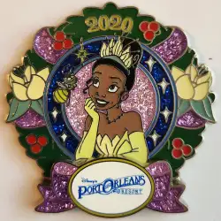 Port Orleans Resort - Tiana Wreath is a Limited Edition (LE) 3000 pin from the Resort Holiday Collection 2020: Glitter Wreaths pin series. It was originally released in November, 2020 and was available from Walt Disney World .
