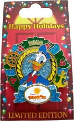 Paradise Pier Hotel - Donald Duck Wreath is a Limited Edition (LE) 1000 pin from the Resort Holiday Collection 2020: Glitter Wreaths pin series. It was originally released in November, 2020 and was available from Disneyland Resort .