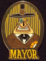 Grinning Mayor (Grey) is an Open Edition pin in the Full Set 4-pin set from the The Nightmare Before Christmas Oval Names Booster Set pin series. It was originally released on , 2014 and was available from Disneyland Resort Paris .