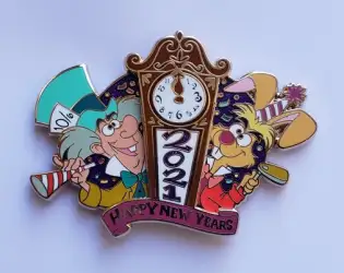Happy New Year 2021 - Mad Hatter and March Hare is a Limited Edition (LE) 200 pin from the New Year's Eve/Day pin series. It was originally released on , 2020 and was available from Disney Studio Store Hollywood / Soda Fountain .