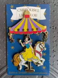 Snow White - Princess Carousel is a Limited Edition (LE) 700 pin from the Le Carrousel de Lancelot pin series. It was originally released on , 2019 and was available from Disneyland Resort Paris .
