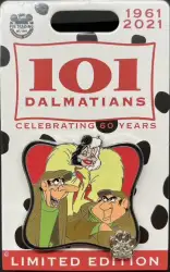 Cruella De Vil with Horace & Jasper is a Limited Edition (LE) 4000 pin from the 101 Dalmatians 60th Anniversary pin series. It was originally released on , 2021 and was available from Multiple Sources (WDW, DLR, etc.).