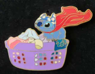 Stitch in Laundry Basket is an Open Edition pin from the Lilo & Stitch pin series. It was originally released on , 2004 and was available from Multiple Sources (WDW, DLR, etc.).