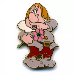 Sneezy Holding a Pink Flower is an Open Edition pin from the Seven Dwarf Jeweled Flower Series pin series. It was originally released on , 2007 and was available from Multiple Sources (WDW, DLR, etc.).