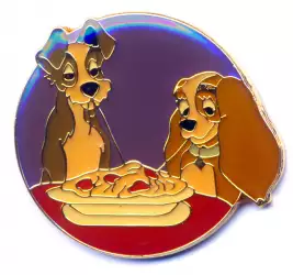 Lady and Tramp Eating Spaghetti is a Limited Release pin from the Disney Channel 10th Anniversary 1993 Set of 10 Pins pin series. It was originally released on , 1993 and was available from an Officially Licensed Disney trading pin vendor (see description for more information).