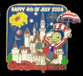 2004 - Jiminy Cricket in front of Cinderella's Castle is a Limited Edition (LE) 2000 pin from the 4th of July/Independence Day pin series. It was originally released in July, 2004 and was available from Walt Disney World .