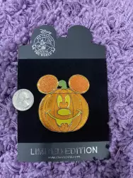 Large glitter mickey pumpkin head is a Limited Edition (LE) 300 pin from the Halloween 2010 pin series. It was originally released in November, 2010 and was available from Multiple Sources (WDW, DLR, etc.).