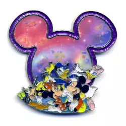 Mickey, Minnie, Donald, Daisy, Goofy & Pluto in front of a Lenticular Mickey Head is an Open Edition pin from the Mickey Head & Ears pin series. It was available from Hong Kong Disneyland .