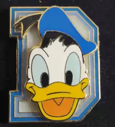 Donald Duck with Letter D is an Open Edition pin from the Block Varsity Letters pin series. It was originally released on , 2005 and was available from Multiple Sources (WDW, DLR, etc.).