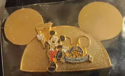 Golden Mickey Ears Hat with Logo is an Open Edition pin from the Happiest Celebration on Earth pin series. It was originally released on , 2005 and was available from Walt Disney World .