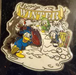 Donald and nephews snowball fighting is an Open Edition pin from the Disney Parks Seasons - Winter pin series. It was originally released on , 2005 and was available from Walt Disney World .