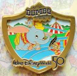 Dumbo the Flying Elephant is a Limited Edition (LE) 2000 pin from the Walt Disney World 50th Anniversary Attraction Crests Collection pin series. It was originally released in October, 2021 and was available from Walt Disney World .