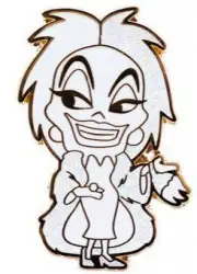 Cruella White Chase is a Limited Edition (LE) 150 pin from the Pink A La Mode (PALM) - Cute Villains Blind Box pin series. It was originally released on , 2021 and was available from an Officially Licensed Disney trading pin vendor (see description for more information).
