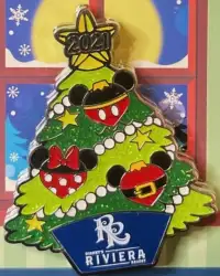 Riviera Resort - Mickey & Minnie is a Limited Edition (LE) 2000 pin from the Resort Holiday Collection 2021: Christmas Trees pin series. It was originally released on , 2021 and was available from Walt Disney World .