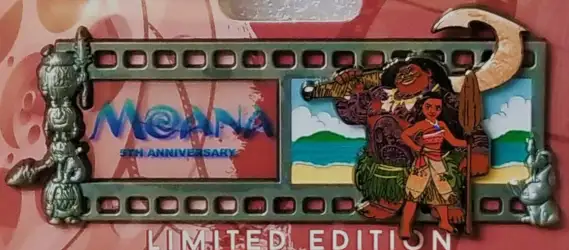Moana 5th Anniversary is a Limited Edition (LE) 250 pin from the Anniversary Film Strip Series pin series. It was originally released on , 2021 and was available from Walt Disney Imagineering .