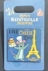 Live the Cheese Life is an Open Edition pin from the Remy's Ratatouille Adventure pin series. It was originally released in October, 2021 and was available from Multiple Sources (WDW, DLR, etc.).