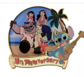 Lilo and Stitch Family 10th Anniversary (surprise release) is a Limited Edition (LE) 300 pin from the Lilo & Stitch pin series. It was originally released on , 2012 and was available from Disney Studio Store Hollywood / Soda Fountain .