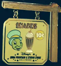 Jiminy Cricket is a Limited Edition (LE) 300 pin from the Retro Ice Cream Sign pin series. It was originally released on , 2012 and was available from Disney Studio Store Hollywood / Soda Fountain .