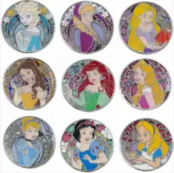 9 princesses is a Limited Release pin from the Tokyo Stained Glass Princess Series pin series. It was originally released on , 2015 and was available from Tokyo Disneyland Resort .