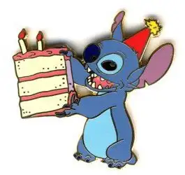 Stitch with Birthday Cake is an Open Edition pin from the Lilo & Stitch pin series. It was originally released on , 2005 and was available from Multiple Sources (WDW, DLR, etc.).
