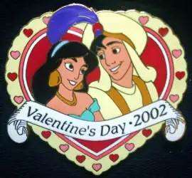 Jasmine & Aladdin is a Limited Edition (LE) 2500 pin from the Valentine's Day Hearts 2002 pin series. It was originally released on , 2001 and was available from Disneyland Resort .