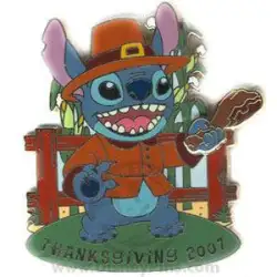 Stitch - Thanksgiving 2007 is a Limited Edition (LE) 300 pin from the Thanksgiving pin series. It was originally released on , 2007 and was available from Disney Studio Store Hollywood / Soda Fountain .