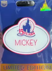 15th Anniversary - Mickey Nametag is a Limited Edition (LE) 600 pin from the Walt Disney World 50th Anniversary Cast Member Name Tags pin series. It was originally released in February, 2022 and was available from Walt Disney World .