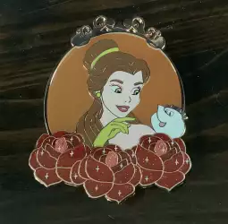 Pin features Belle and Mrs. Potts from Beauty and the Beast