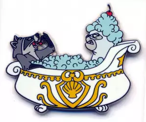 Meeko and Percy in a Bath Tub is an Open Edition pin from the Pocahontas pin series. It was originally released on , 2021 and was available from Multiple Sources (WDW, DLR, etc.).