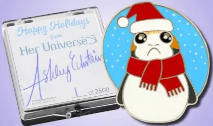 Porg Holiday is a Limited Edition (LE) 2500 pin from the Her Universe Holiday Pin pin series. It was originally released in December, 2018 and was available from an Officially Licensed Disney trading pin vendor (see description for more information).