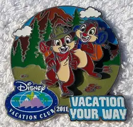 Chip and Dale hiking in mountains is a Limited Edition (LE) 2000 pin from the Vacation Your Way pin series. It was originally released on , 2011 and was available from Disney Vacation Club .