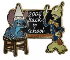 Stitch and Pleakley - Back to School is a Limited Edition (LE) 300 pin from the Lilo & Stitch pin series. It was originally released on , 2006 and was available from Disney Studio Store Hollywood / Soda Fountain .