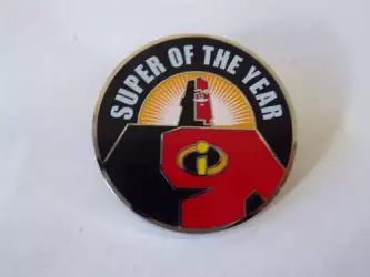 Super of the Year is an Open Edition pin in the Full Set 4-pin set from the Pixar Hero Leader Award Starter Set pin series. It was originally released on , 2014 and was available from Multiple Sources (WDW, DLR, etc.).
